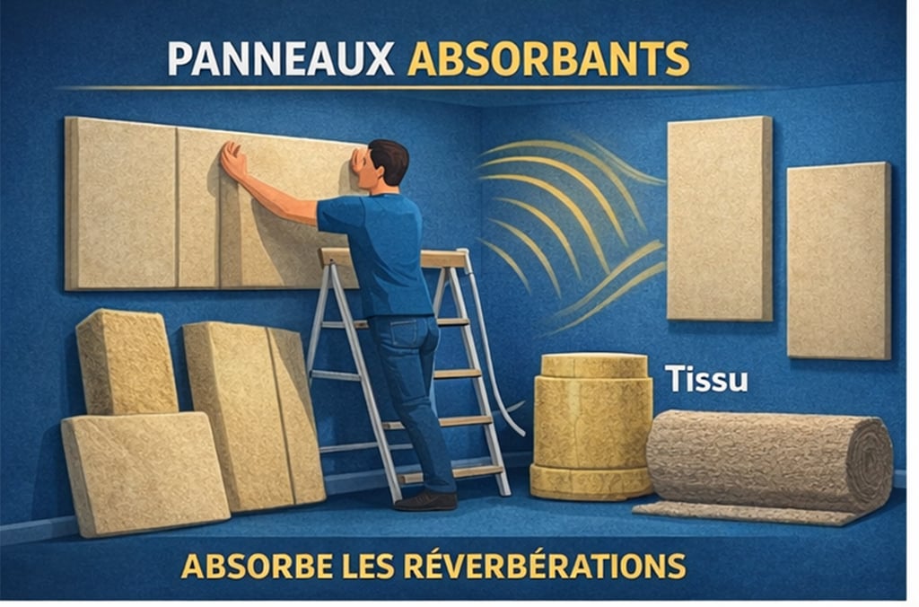 Tapis épais, rideaux lourds, panneaux absorbants et diffusion via bibliothèques ou panneaux diffusants.