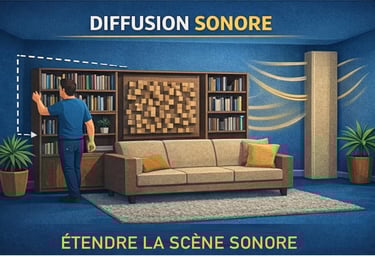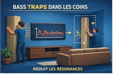 Creux ou zones mortes → déplacer les enceintes, ajouter diffusion via bibliothèques ou panneaux diffusants